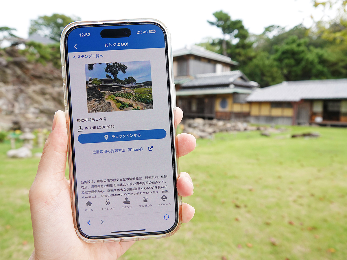 JR西日本のスマホアプリ「WESTER」の「インザループ2025」のデジタルスタンプラリーのチェックイン画面(和歌の浦あしべ庵)