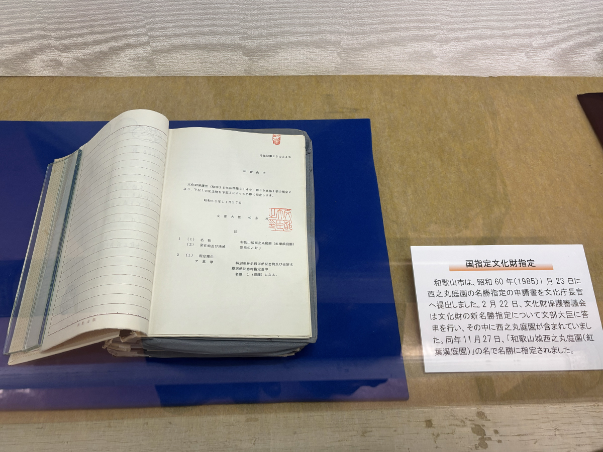 和歌山城天守閣に展示された名勝指定を通知する書面
