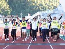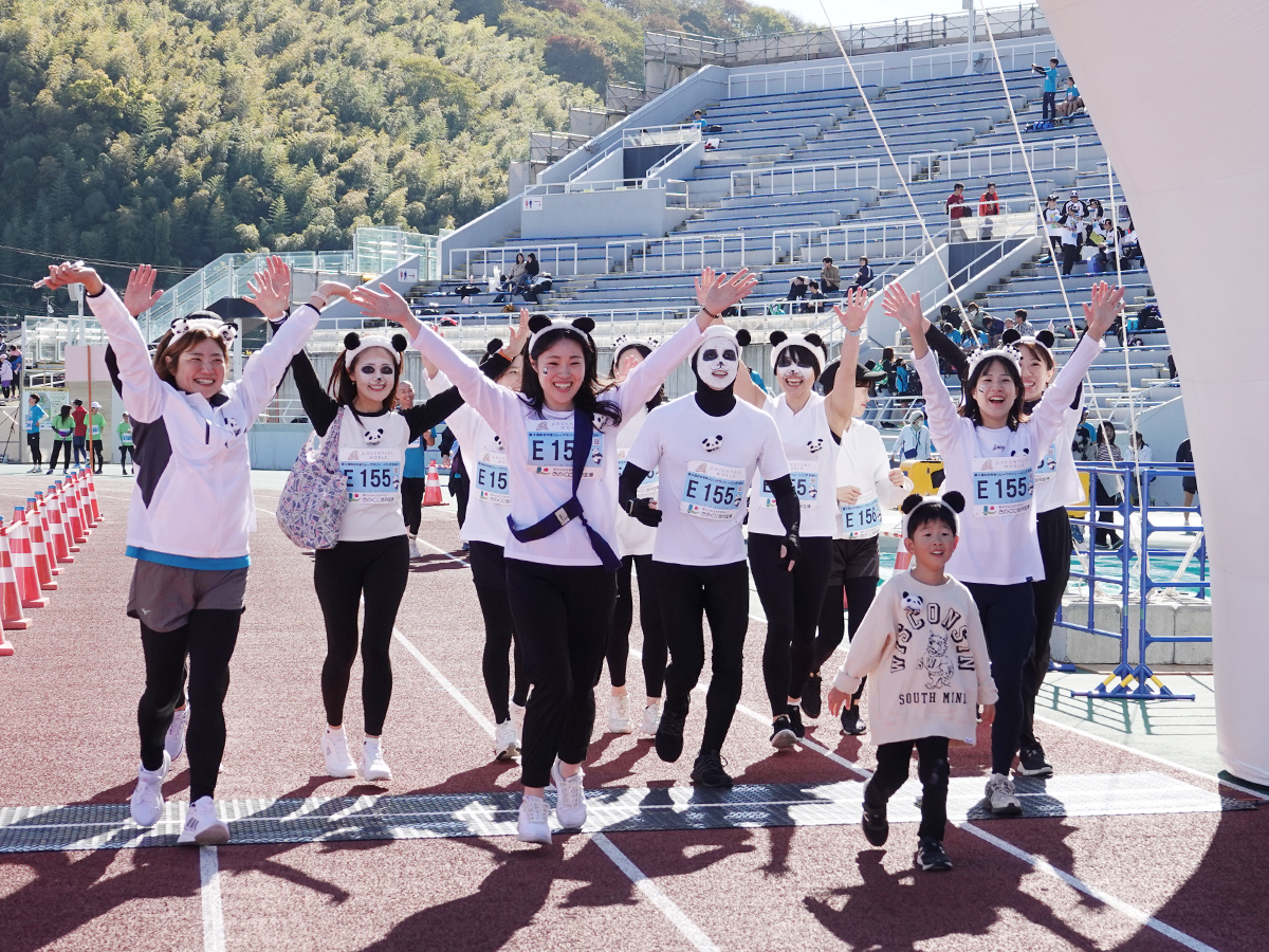 「わかやまリレーマラソン パンダラン」で笑顔でゴールするランナーたち