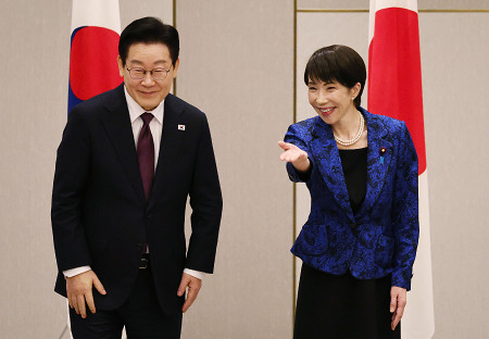 首脳会談に臨む韓国の李在明大統領(左)と高市早苗首相。太平洋戦争中に水没した山口県宇部市の海底炭鉱「長生炭鉱」から見つかった遺骨について、身元確認に協力することで一致した=13日午後、奈良市 【時事通信社】
