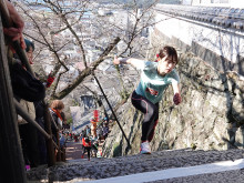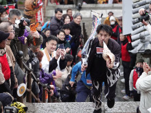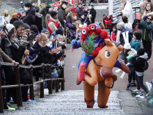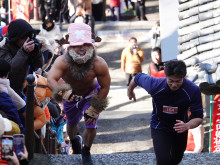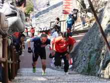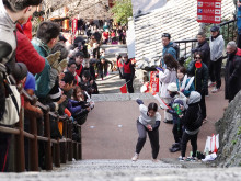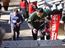 今年は過去最多の245人が申し込み、当日は5歳~87歳の218人が県内外から参加。急な石段を駆け上がった。ふんどし姿や恐竜の着ぐるみ、干支(えと)にちなみウマのコスプレ姿で駆け上がる人もおり、会場は声援や拍手、笑い声に包まれた。