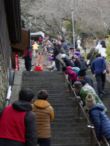 新たな決意を掲げ一年の無事を願う「速駈詣り」は今年で9回目。楼門から本堂まで続く210段の石段「結縁(けちえん)坂」を2人ずつ駆け上がり、本堂で参拝する。参加者には当日限定の御朱印を授与する。タイムを測定し、10代未満から70代までの年代別表彰に加え、最も速い男女を「福結び速駈王」「福結び速駈姫」、最高齢者を「健脚王」として表彰する。