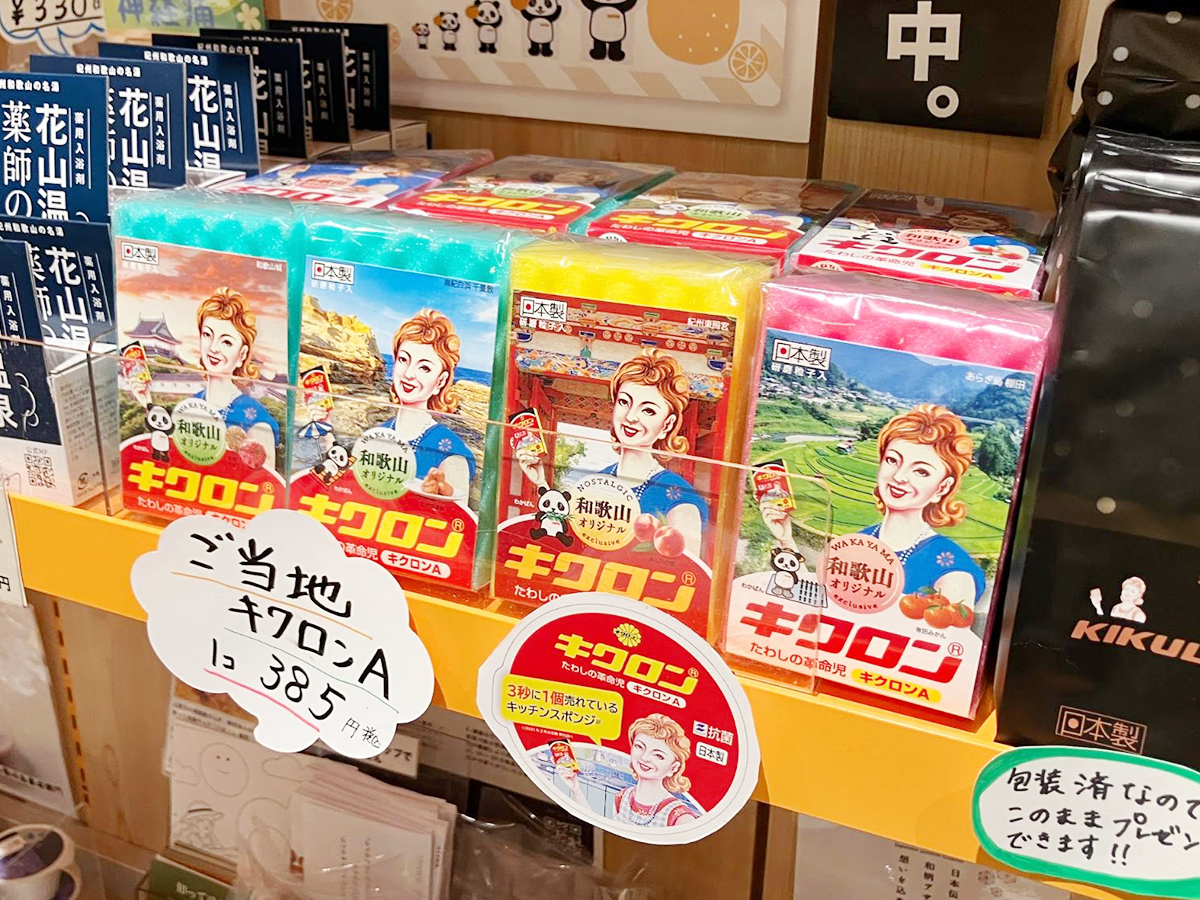 同社広報室の塩田かおりさんは「貼り合わせキッチンスポンジは、和歌山県が発祥の地とたくさんの人に知ってもらおうとご当地デザインを企画した。土産としての購入をきっかけにキクロンAの品質や使い心地も体感してもらいたい」と話す。