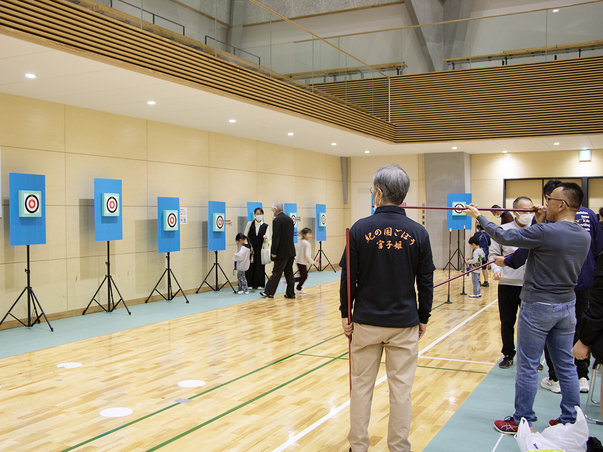 「ワールドマスターズゲームズ2027関西」のエントリー開始を記念して開催された「わかやまスポーツ体験会」でスポーツウエルネス吹矢を体験する様子