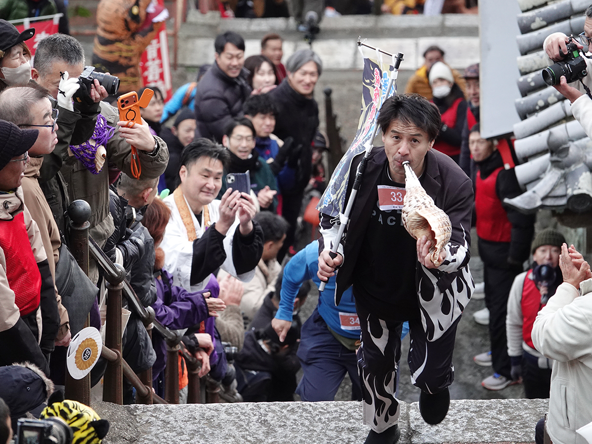 富山県からエントリーし、ほら貝を吹きながら石段を駆け上がる「福開き速駈詣り」参加者