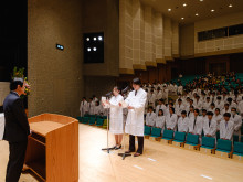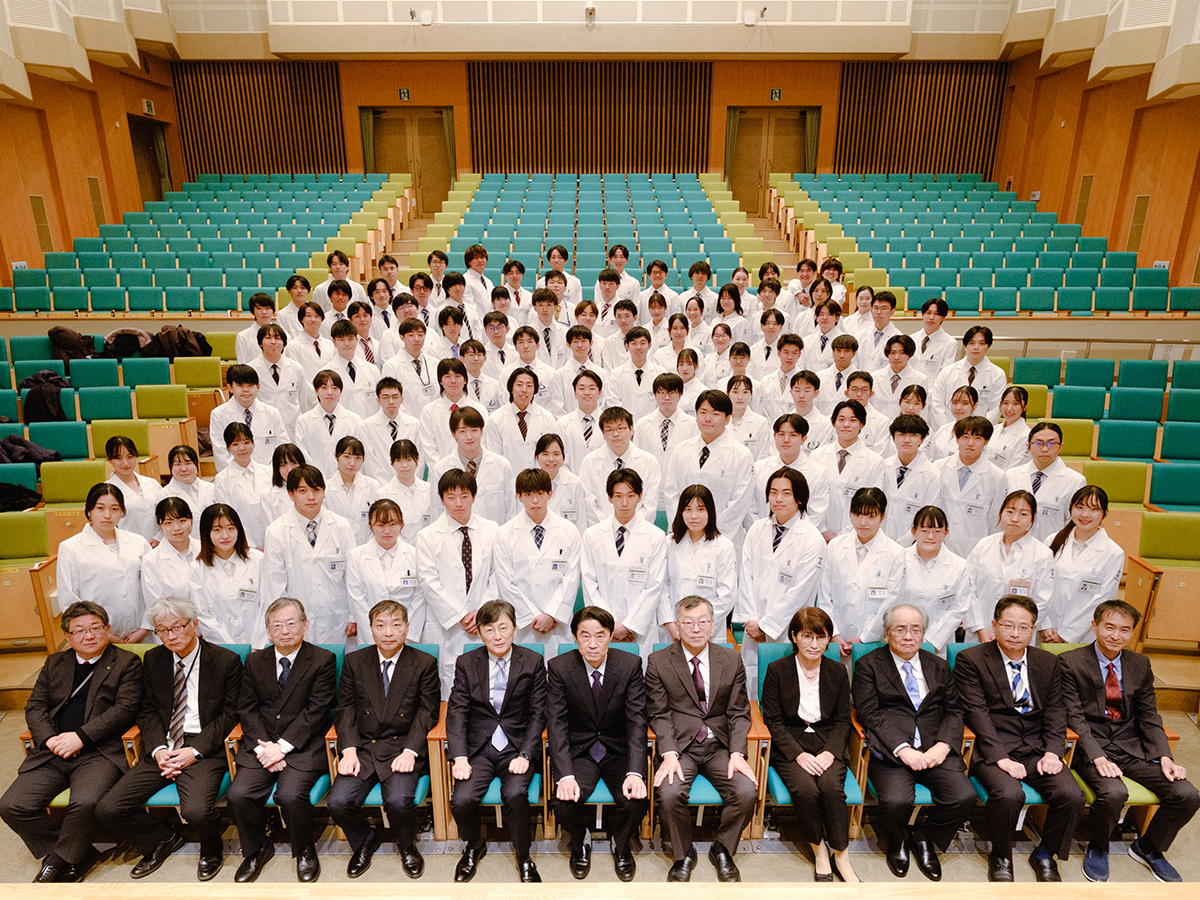 和歌山県立医科大学付属病院などで始まる臨床実習を前に医学部4年の学生に教員らが白衣を手渡す式典が1月23日、同大紀三井寺キャンパス(和歌山市紀三井寺)で行われた。