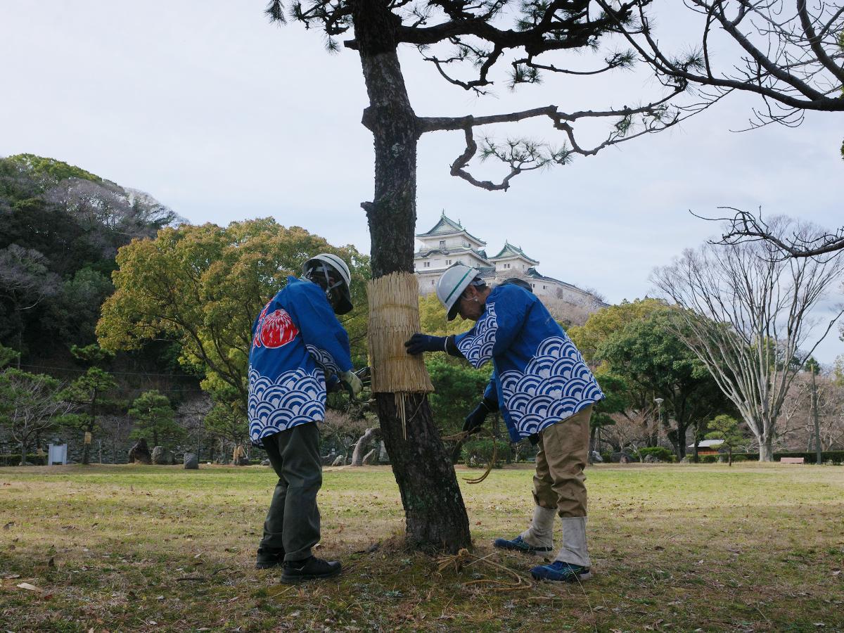マツの木の「こも外し」作業が3月5日、和歌山城公園(和歌山市一番丁)で行われた。