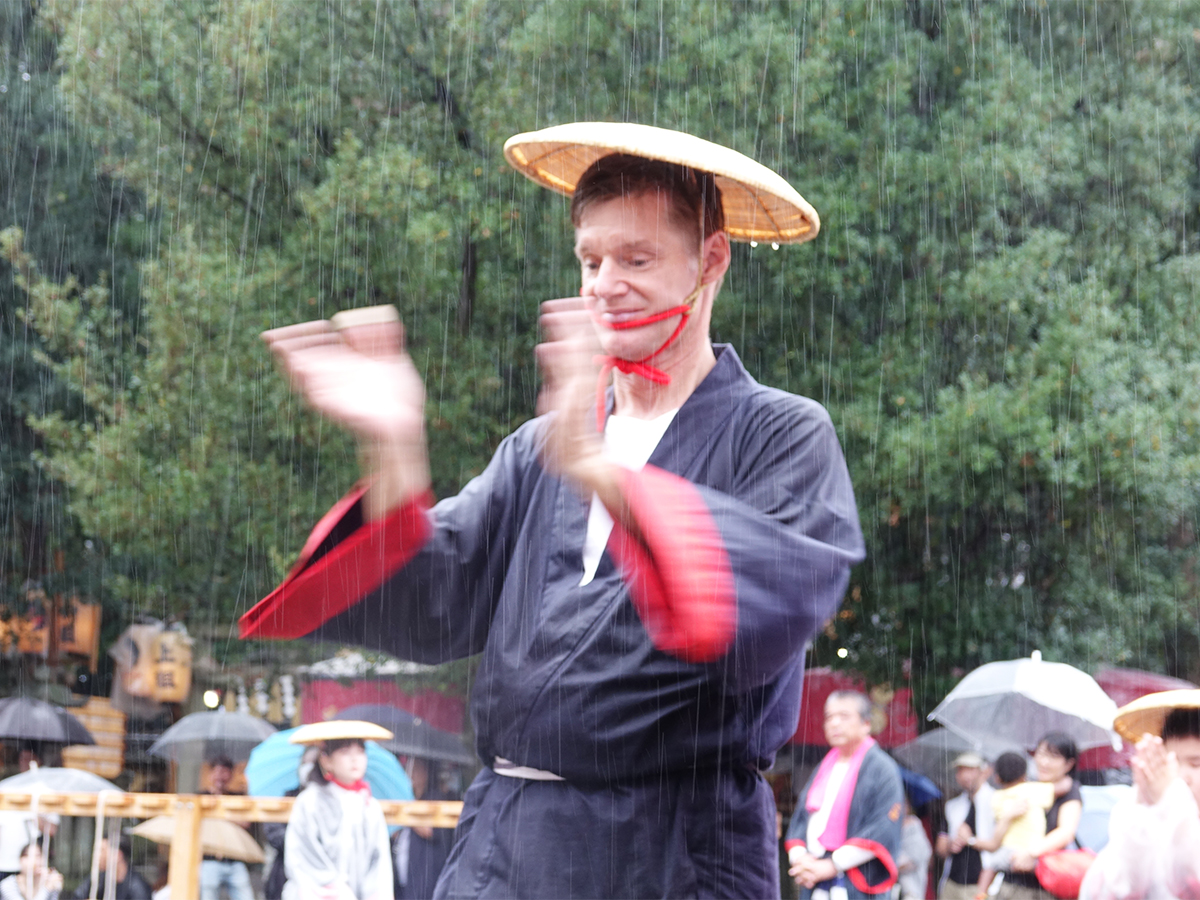 雨が降り頻る中の奉納演芸