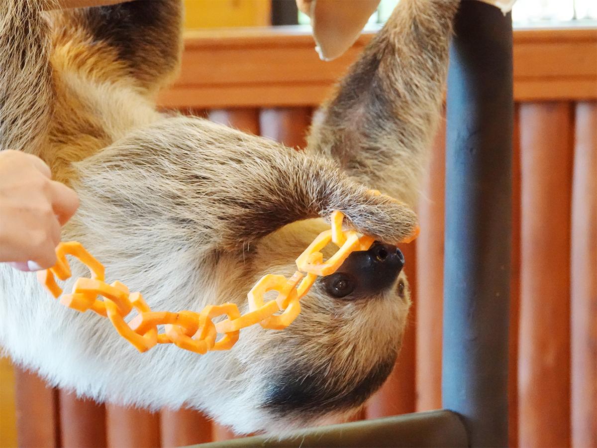 来園者が手にしたニンジンのリボンを食べる「アドベンチャーワールド」のフタユビナマケモノ