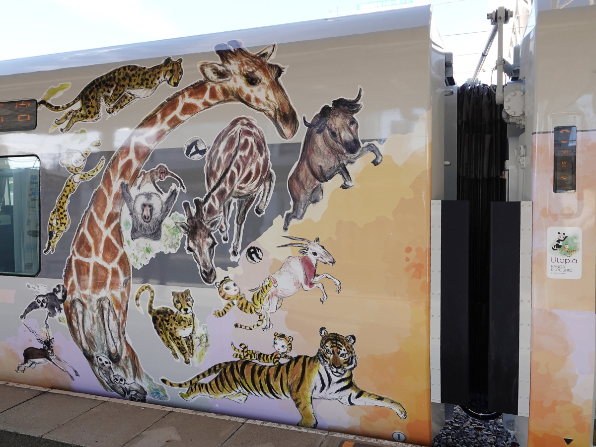 天野喜孝さんが描いた動物のイラストでラッピングした「パンダくろしお『Utopia Smileトレイン』」