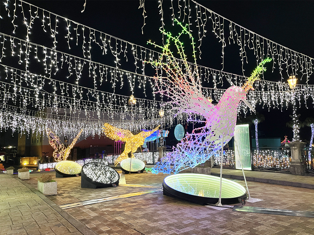 和歌山マリーナシティで開催中の「フェスタ・ルーチェ」の光と鏡を組み合わせた新エリア「インフィニティバード」