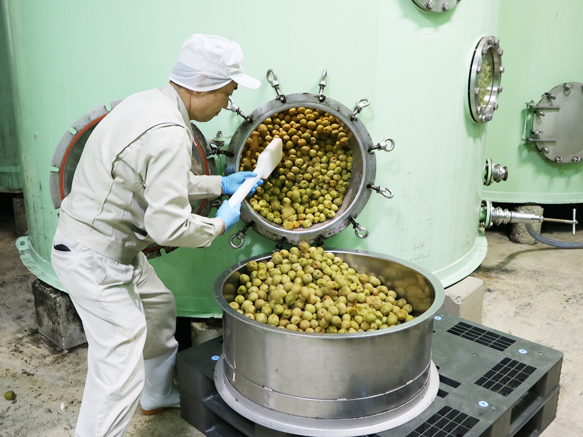 ウメを漬け込んだタンクから実を取り出す梅酒杜氏の藤原さん