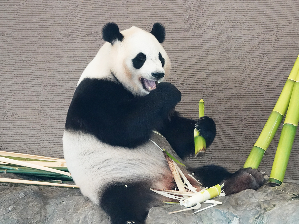 アドベンチャーワールドの希少動物繁殖センター「パンダラブ」で公開最終日も変わらず竹を食べるジャイアントパンダ「楓浜」