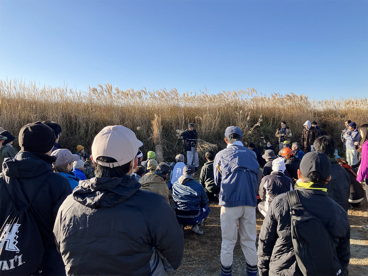 かやぶき職人の山田雅史さんたちからレクチャーを受ける参加者