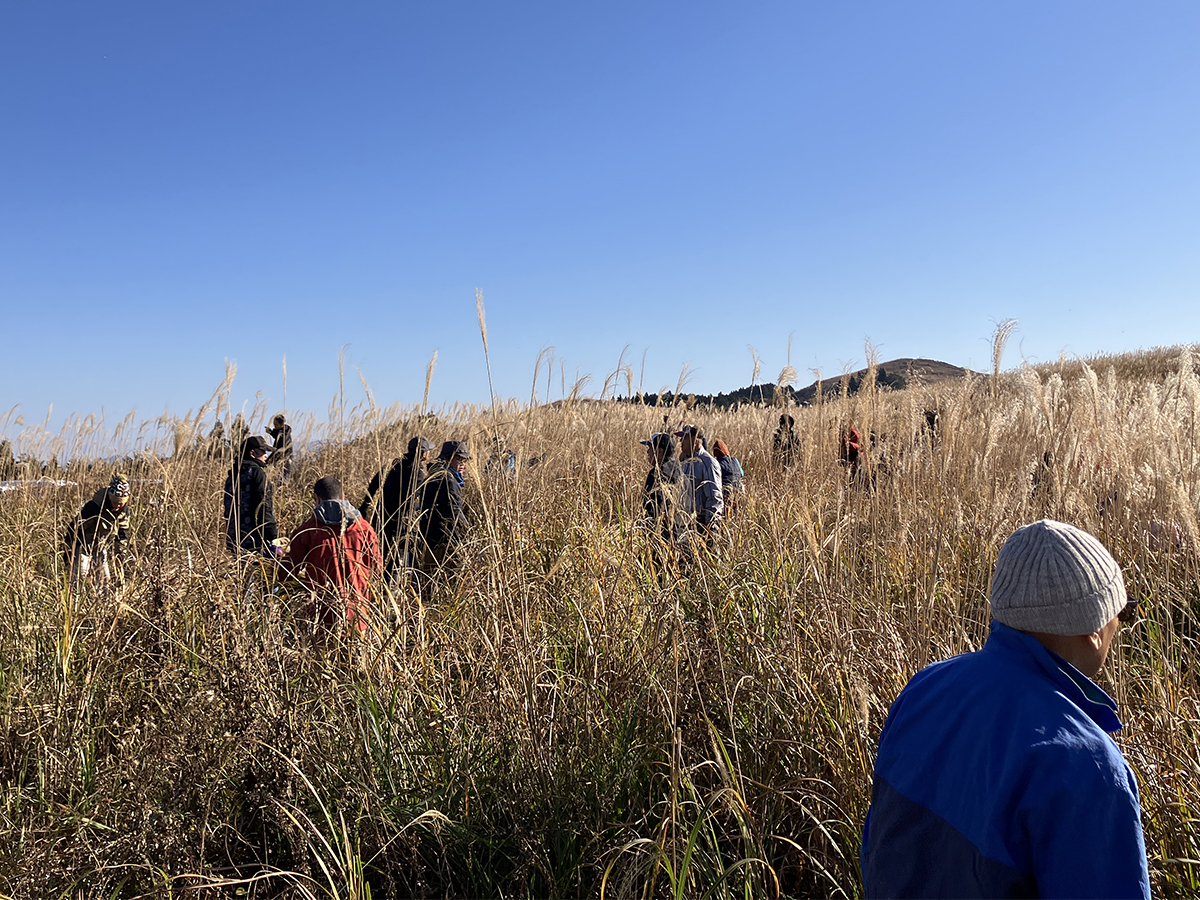 ススキを刈ってかやぶき屋根用の材としての活用を目指すイベント「茅刈りレスキュー」が12月7日、生石高原で開催された。