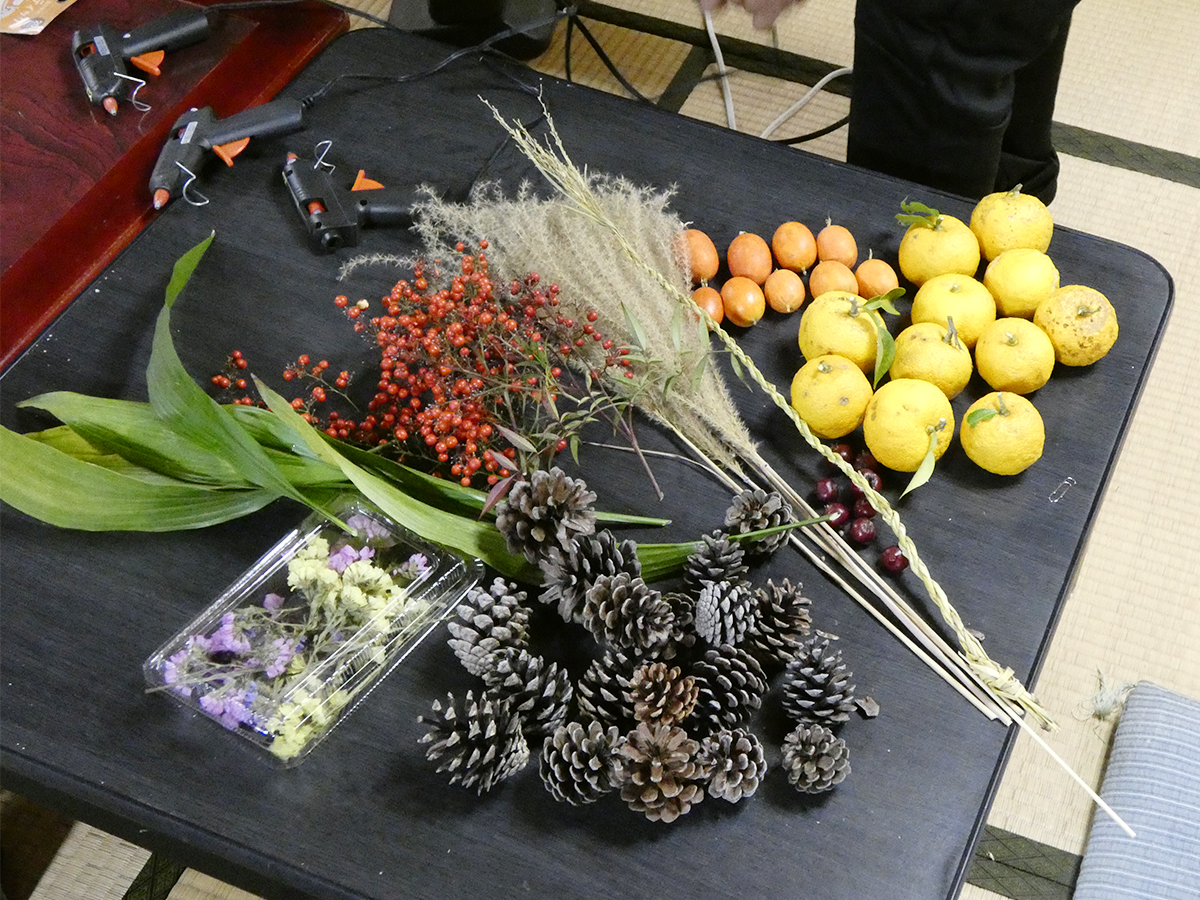紀美野・中田の棚田のしめ縄作りワークショップでしめ縄飾りに使う飾りのススキや松ぼっくりなど