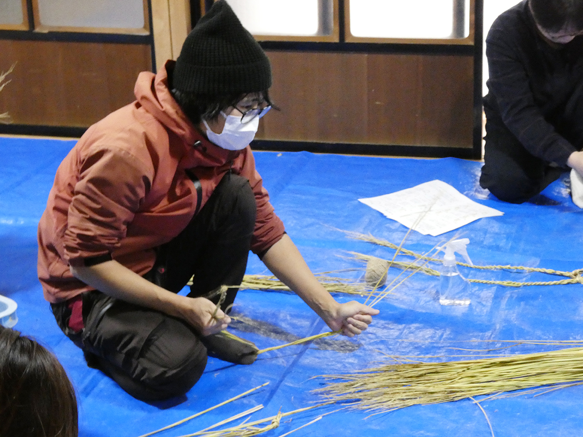 中田の棚田で収穫された稲でしめ縄を作るワークショップ「しめ縄飾り体験」が12月21日、紀美野町で開催された。