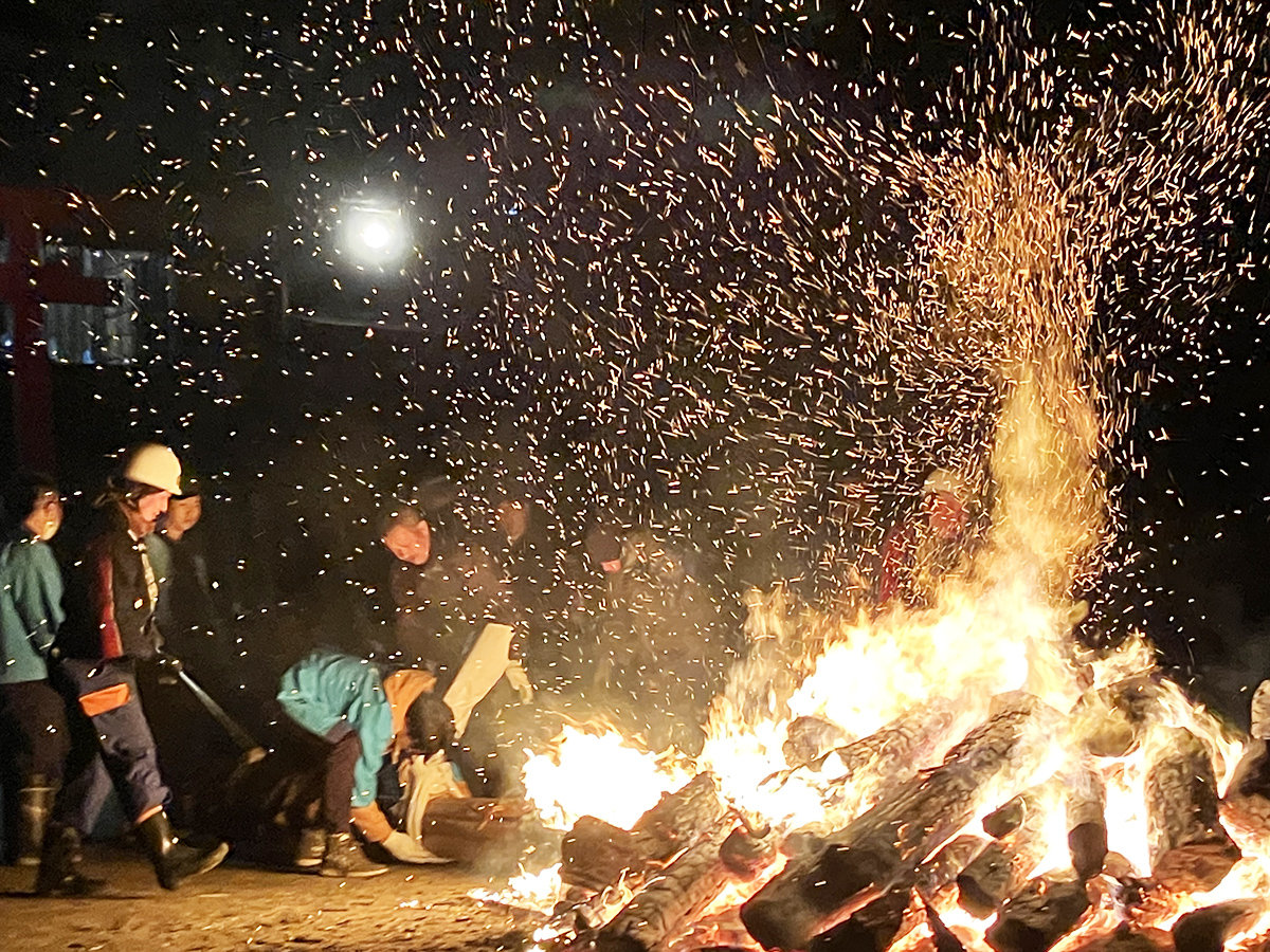 下花園神社境内で行われた「たい松押し」でのたき火の様子