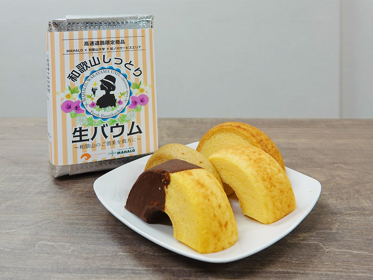 和歌山大学の学生が地元企業と共同開発した「和歌山しっとり生バウム」の販売が12月25日、阪和自動車道・紀ノ川サービスエリア上下線ショッピングコーナーで始まった。