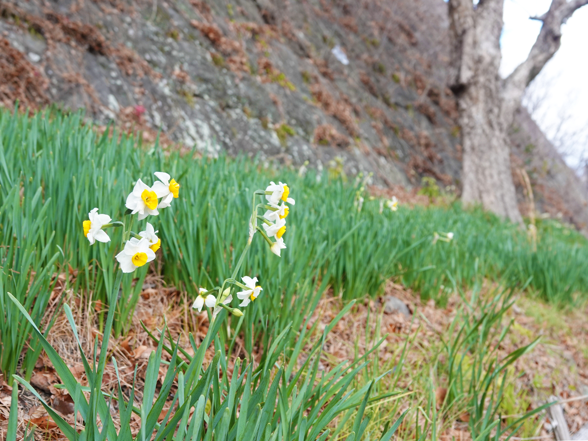 少しずつ咲き始めた和歌山城不明門付近のスイセン
