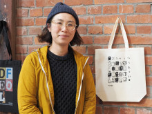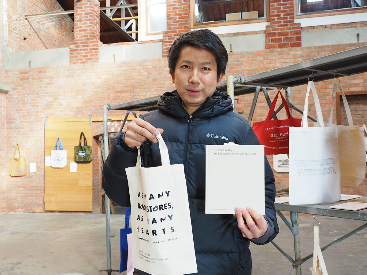海南市の旧田島うるし工場で書籍「Over 100 ToteBags from Bookstores in Our Everyday Lives」と購入特典のトートバッグを手にする助野さん
