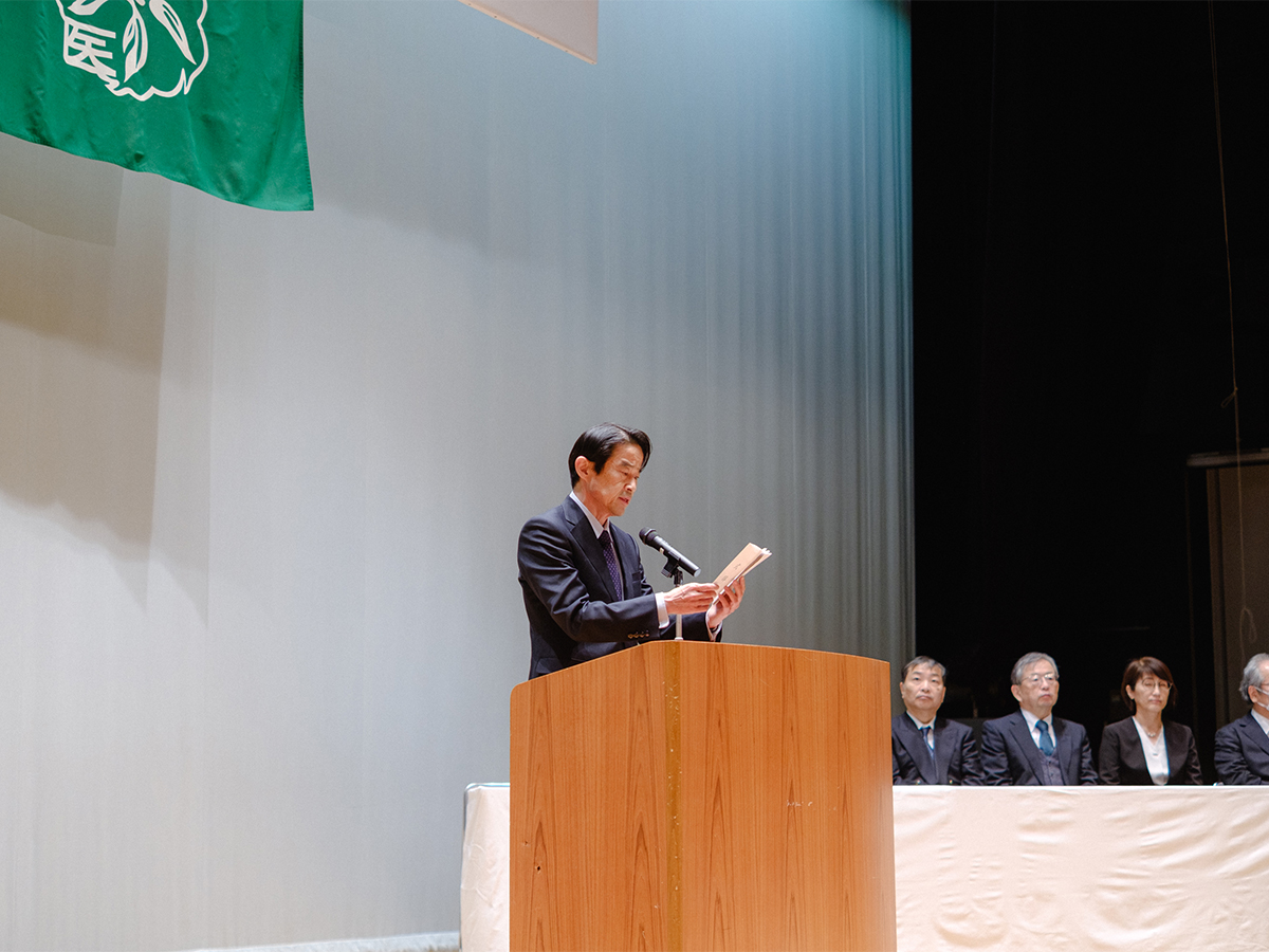 和歌山県立医科大学医学部学生を前に式辞を述べる中尾直之理事長