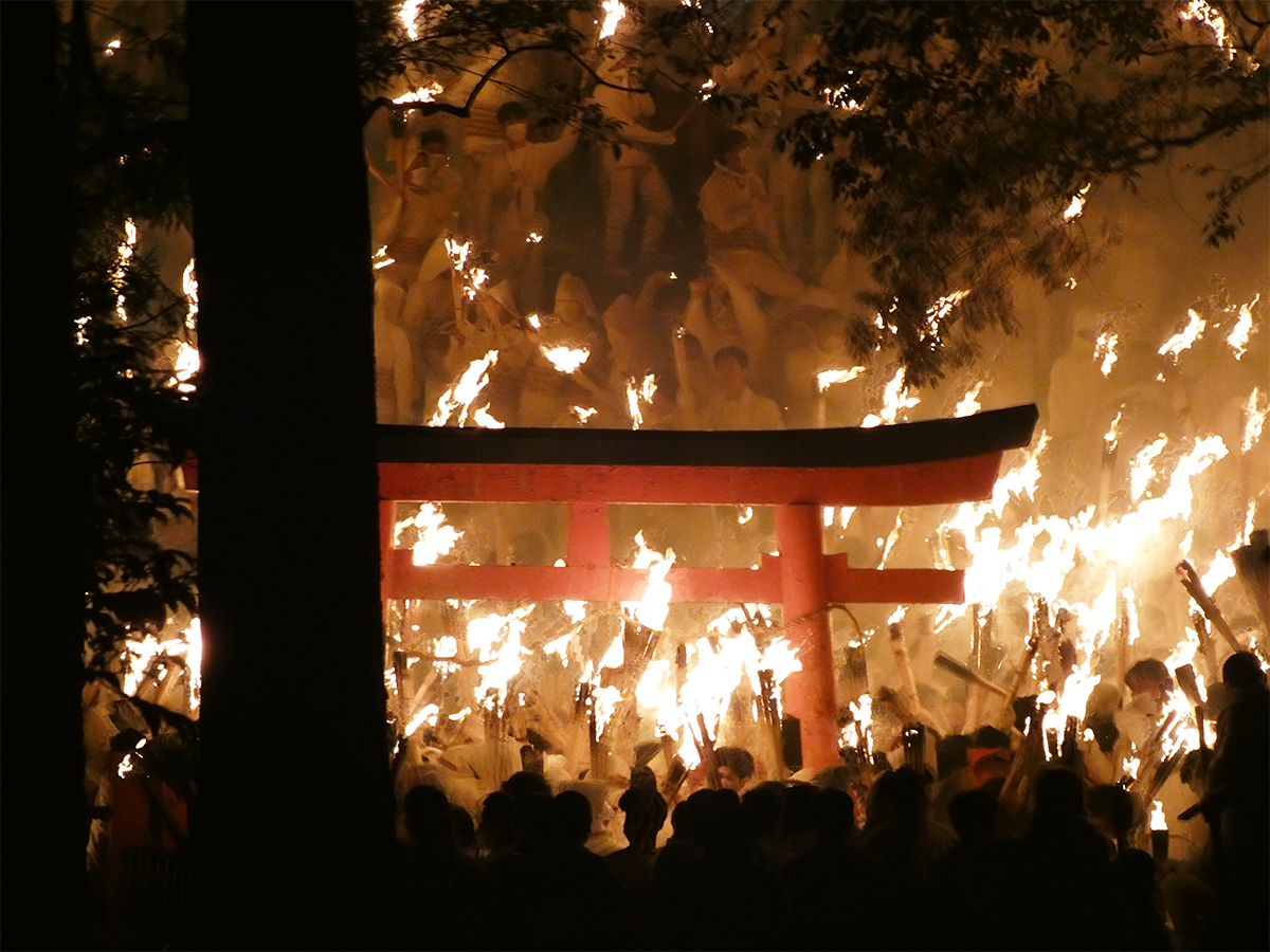 新宮・神倉神社「御燈祭り」で火をつけ鳥居の下でたいまつを叩き合いをしている様子