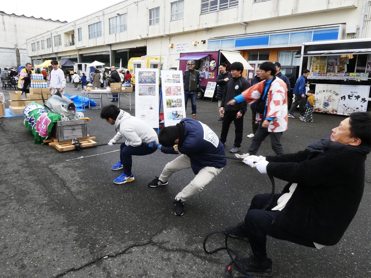 「やりすぎまぐろフェス」フィナーレイベント会場で45キロのマグロを再現したオブジェを引く体験をする来場者