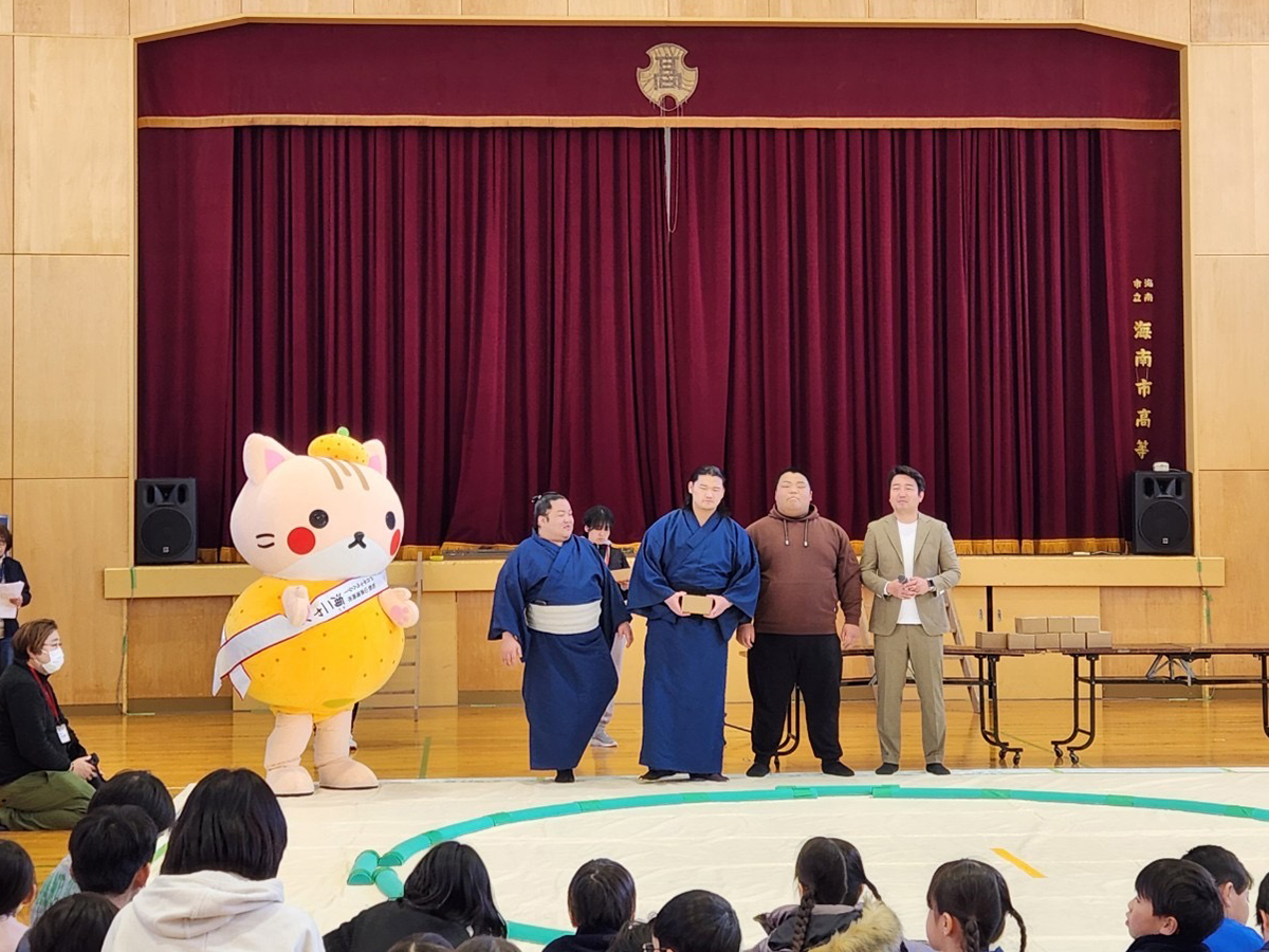 2025年に開催された「海南フェス」での力士たちと海南市のマスコットキャラクター海ニャン