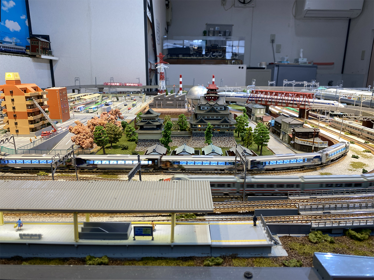 「鉄道模型喫茶紫音」店内に設置されたジオラマと鉄道模型のコース