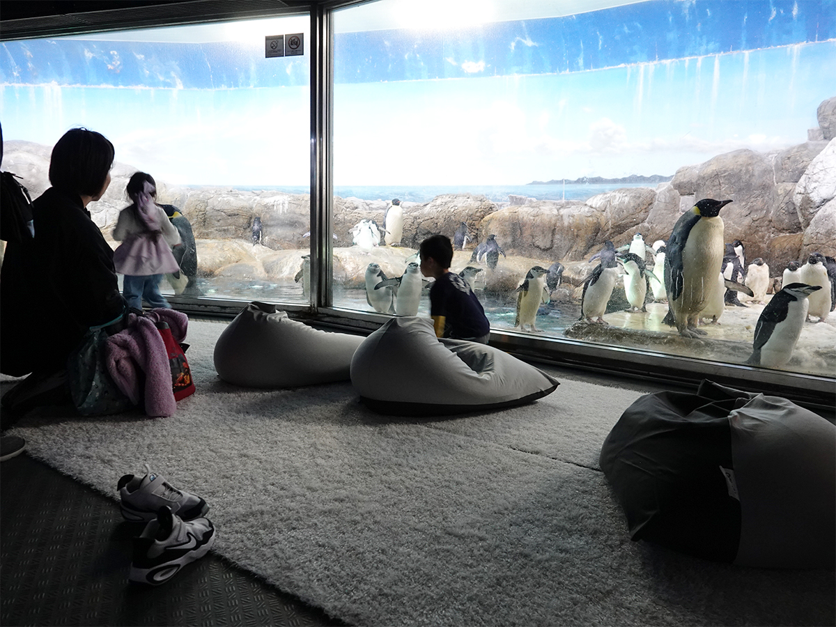 ペンギンの展示室の前でクッションに座って眺められる「ペンギンワールド・ラウンジ」(アドベンチャーワールド)