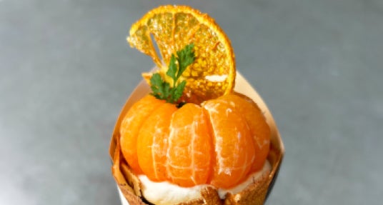 中野農園のみかんをまるごと1個使用した、冬限定のテイクアウトクレープ。生クリームとカスタードの優しい甘さが、みかんのジューシーな果実感を引き立てます。見た目もかわいく、ちょっと贅沢な冬のおやつにぴったり。