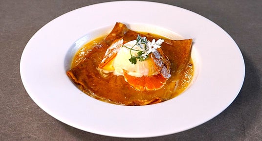 地元和歌山・中野農園(エコファーマー認定)の有田みかんを使った特製ソースを、香ばしいクレープとバニラアイスにたっぷりかけた贅沢な一皿。みかんの爽やかな酸味とバニラのまろやかさが溶け合う、冬限定の華やかなデザートです。