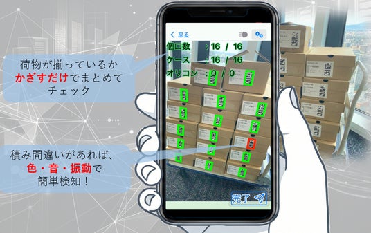 「ArU-cana」は、スマートフォンをかざすだけで荷物につけられたコードをまとめて認識し、荷物が揃っているか、積込対象外の荷物が紛れ込んでいないかを出荷データと照合してチェックできる、誤配送防止システムです。
