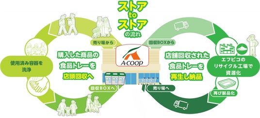 JAわかやまAコープの店舗では、お客様が使い終わった食品トレーやペットボトルを回収ボックスで回収しております。回収された大切な資源は、エフピコで「エコトレー」などのエコ製品※2へと生まれ変わります。そして、生まれ変わったエコ製品が再びJAわかやまAコープの売り場で使われることで、お店を発着点とする「ストアtoストア」の水平リサイクルを実現しています。