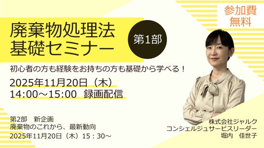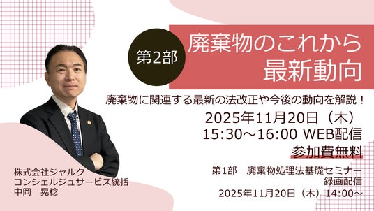 大阪堺筋本町に本社を構える株式会社ジャルクは、11月20日(木)に「廃棄物処理法基礎セミナー」と「廃棄物のこれから、最新動向」をオンラインにて開催いたします。