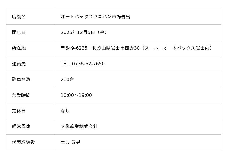 株式会社オートバックスセブン(代表取締役 社長:堀井勇吾)と加盟店契約を結んでいる大興産業株式会社(代表取締役:土岐政晃)は、「オートバックスセコハン市場岩出」を和歌山県岩出市のスーパーオートバックス岩出内に、2025年12月5日(金)オープンいたします。