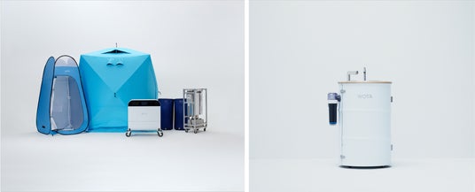 写真左:水循環型シャワー「WOTA BOX」/写真右:水循環型手洗いスタンド「WOSH」