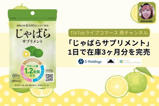 ライブコマース事業、ブランド事業、AI事業などを展開し、日常と未来を彩る最高の体験を創造する株式会社Sホールディングス(本社:東京都品川区、代表取締役CEO: 燕 咏靖)は、当社運営のアパレルブランドABITOKYOが企画・配信するTikTokライブコマース「燕チャンネル」において、2026年3月5日(木)に実施した配信で、株式会社エクセレントメディカル(本社:福井県福井市、代表取締役:服部 直樹)のサプリメント「じゃばらサプリメント」の販売を行いました。今回の配信では、メーカー様が約3ヶ月分として保有していた在庫約2,500個を、配信当日中にすべて販売する結果となりました。