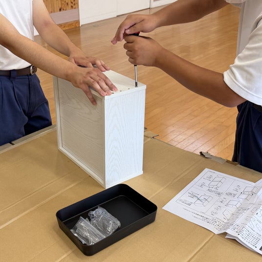 生徒は2~3人一組となり、一つの商品を生徒だけで組み立てをおこなう。授業は、商品梱包を開けるところから始め、組立説明書を見ながら部材をすべて並べ、部材の確認からスタート。その後ドライバー等を使用して、組立説明書通りに完成まで仕上げる。
