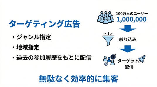 「ターゲティング広告」は、こくちーずプロの会員データを活用し、ジャンルや地域で絞り込んだユーザーに対してイベント情報を配信できる広告メニューです。