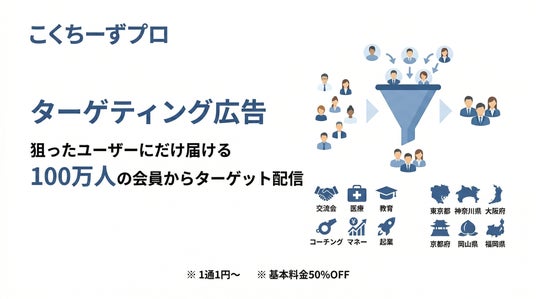 株式会社こくちーず(本社:和歌山県日高郡日高町、代表取締役:太田 憲治)は、イベント・セミナー集客サービス「こくちーずプロ」において、ジャンルや都道府県でターゲットを絞り込み、関心度の高いユーザーにのみ配信できる新広告プラン「ターゲティング広告」の提供を開始しました。累計100万人以上の会員データを活用し、1通1円からの低コストで高精度な集客を実現します。
