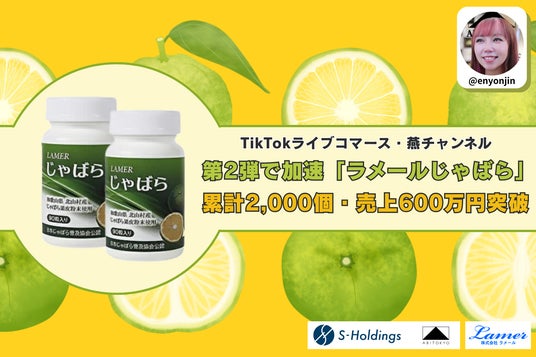 ライブコマース事業、ブランド事業、AI事業などを展開し、日常と未来を彩る最高の体験を創造する株式会社Sホールディングス(本社:東京都品川区、代表取締役CEO: 燕 咏靖)は、当社運営のアパレルブランドABITOKYOが企画・配信するTikTokライブコマース「燕チャンネル」において、株式会社ラメール(本社:東京都港区、代表取締役:飯田広信)のサプリメント、「ラメールじゃばら」の第2弾販売を実施いたしました。2026年3月16日(月) の配信では、約10分の配信で用意した1,000個を完売し、シリーズ累計販売数は2,000個、累計売上は600万円を突破しました。2月24日(火)の販売に続き、高水準の販売実績を記録しています。