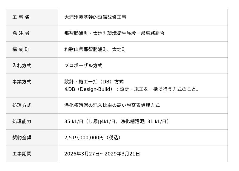 水ing株式会社のグループ会社である水ingエンジニアリング株式会社(社長:須山晃延、本社:東京都港区)は2026年3月27日、和歌山県那智勝浦町と太地町の2町で構成する那智勝浦町・太地町環境衛生施設一部事務組合との間で、「大浦浄苑基幹的設備改修工事」に関する契約を締結しました。