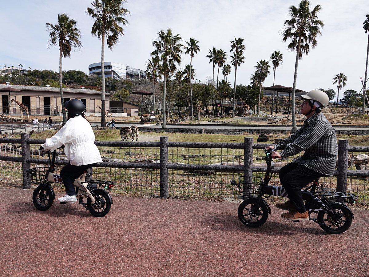 和歌山の電動バイクメーカー「glafit(グラフィット)」製のバイクを使った体験型アトラクション「サファリEバイククルーズ」が3月21日、アドベンチャーワールド(白浜町堅田)で始まった。